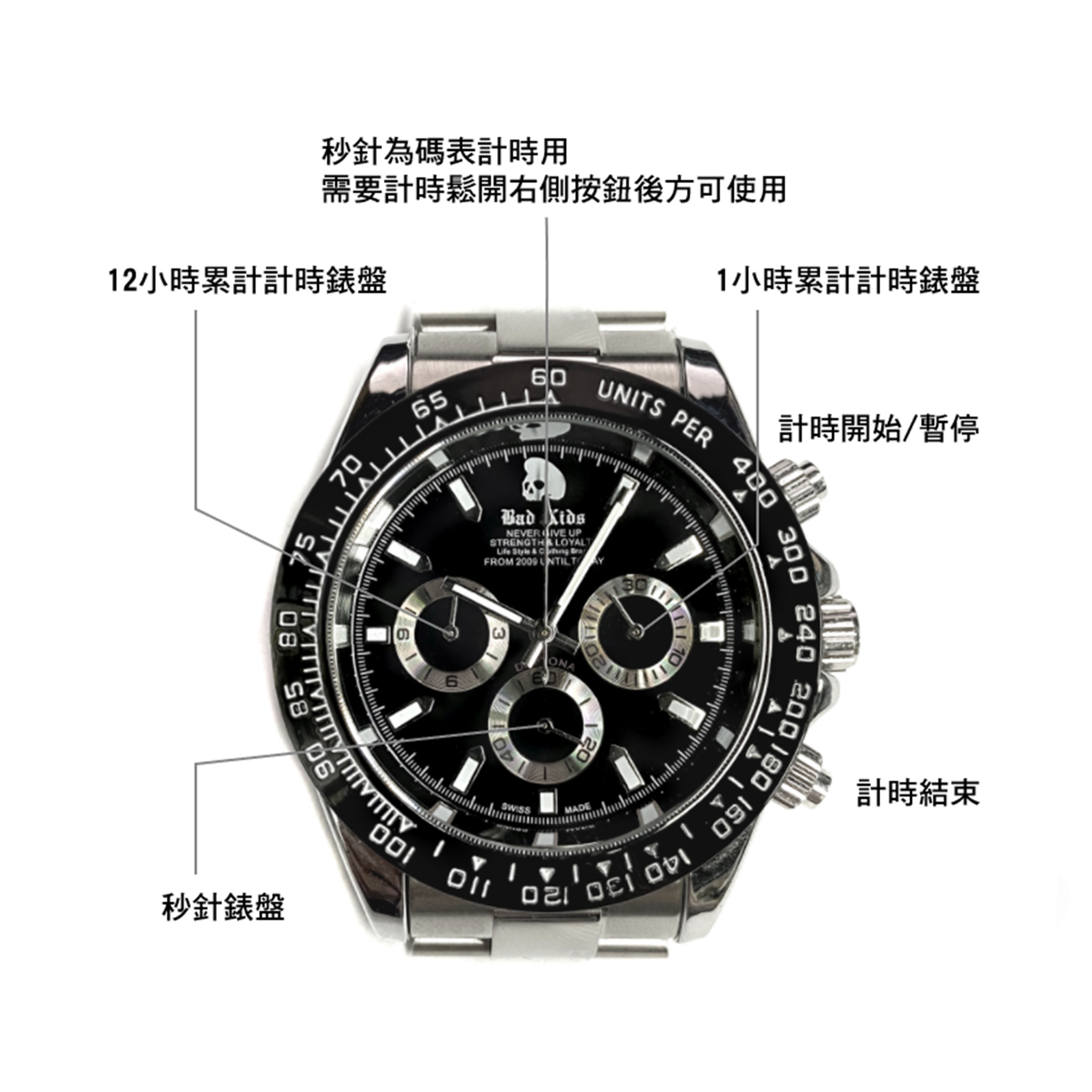 礦物質強化鏡面 合金錶殼 石英機心 不銹鋼錶帶
